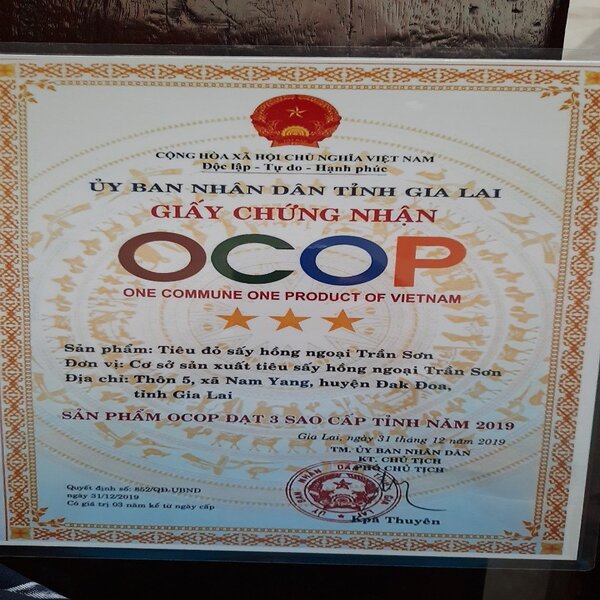 Hạt tiêu sau khi thu hoạch sẽ được làm sạch tạp chất sau đó sàng lọc, lựa chọn những hạt tiêu chất lượng một cách kỹ càng bằng phương pháp thủ công; loại bỏ những hạt không đủ kích cở và cho vào máy sấy hồng ngoại do nông dân trần sơn nguyên cứu và phát triển đã đăng kí bảo hộ độc quyền. Đặc biệt hoàn toàn nói không với việc pha trộn tạp chất vào sản phẩm. Sau đó được đóng thành những gói hạt tiêu thành phẩm đảm bảo chất lượng, kích cỡ đồng đều, nhất là đảm bảo an toàn vệ sinh với giá cả cạnh tranh nhất trên thị trường.
